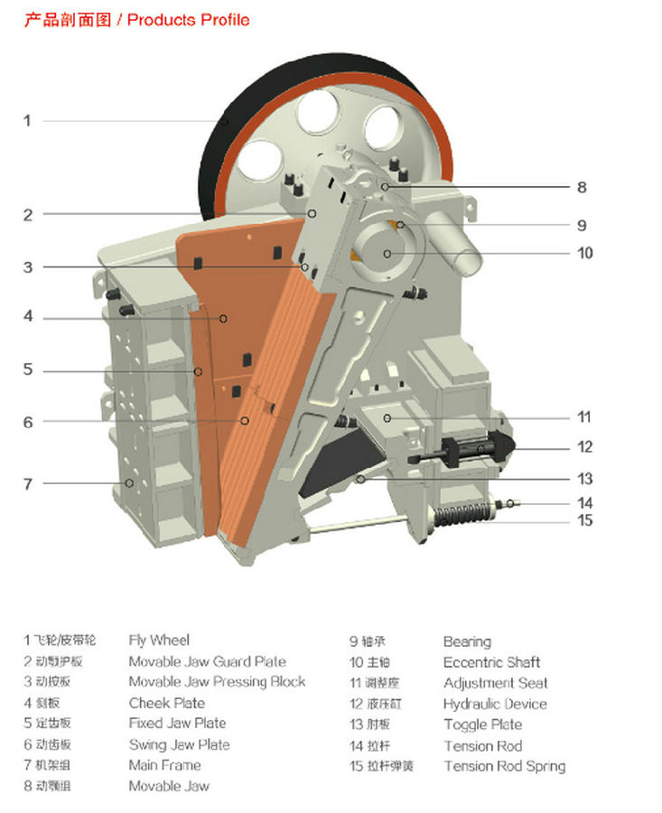 鄂式破碎机主要由:固定颚板、活动鄂板、机架、上下护板、调整座、动鄂拉杆等组成。很好的了解鄂式破碎机的内部结构能对鄂式破碎机使用过程中和出现问题时能起到很好的帮助作用。